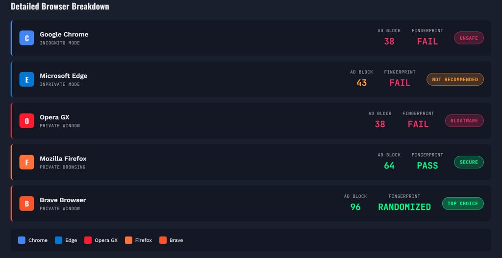 We compared Chrome, Edge, Opera GX, Firefox, and Brave. We tested for signature leaks, ad blocking efficiency, and canvas fingerprinting.
